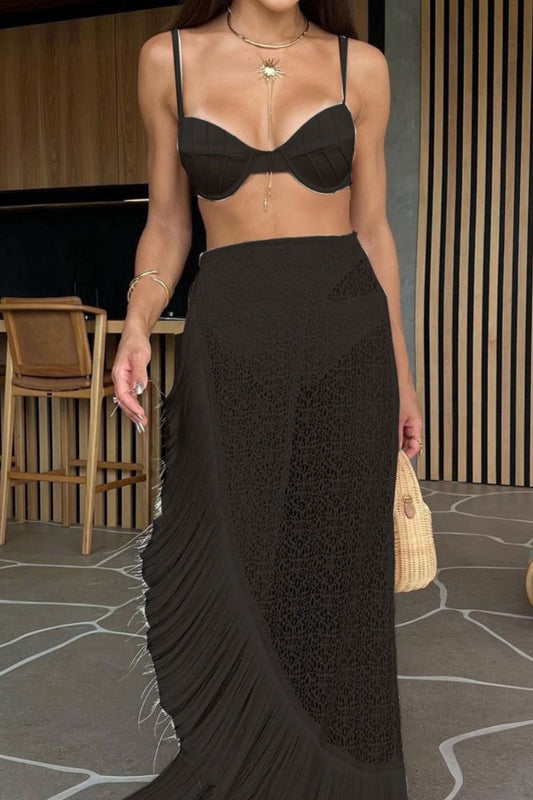 Sexy Vacation Solid Color Fringed Trim See-Through Backless Swimsuit Three Piece Set(4 Colors)
