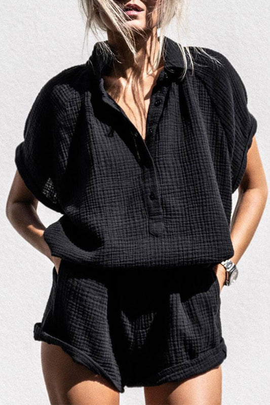 Casual Ripple Contrast Turndown Collar Short Sleeve Two Pieces