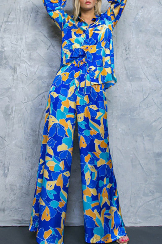 Casual Vintage Geometric Print Contrast Turndown Collar Long Sleeve Two Pieces