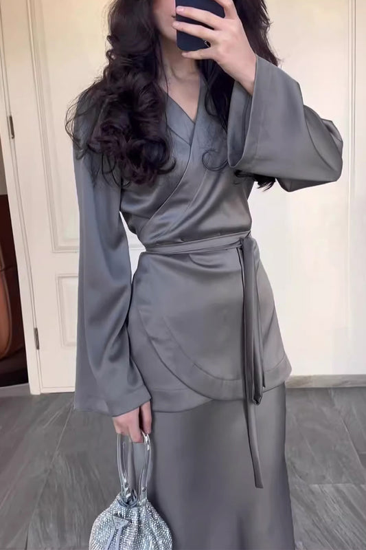 Elegant Simplicity Solid Strap Design V Neck Long Sleeve Two Pieces