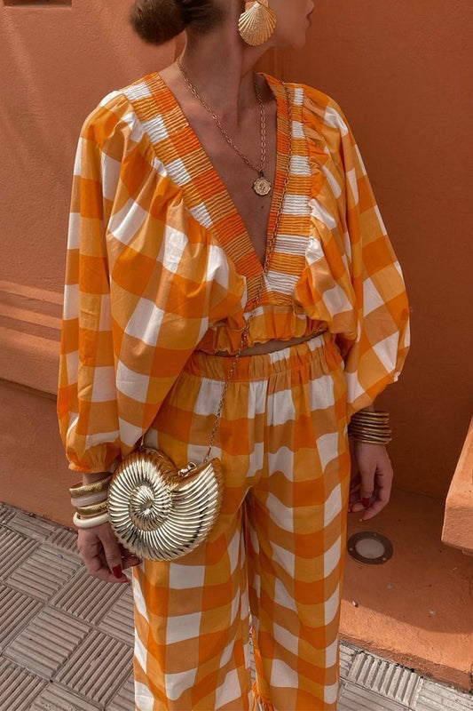 Casual Sweet Plaid Fold Contrast V Neck Long Sleeve Two Pieces