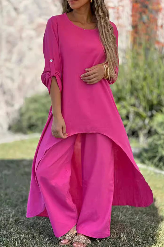 Casual Solid Buttons Asymmetrical O Neck Long Sleeve Two Pieces(3 Colors)