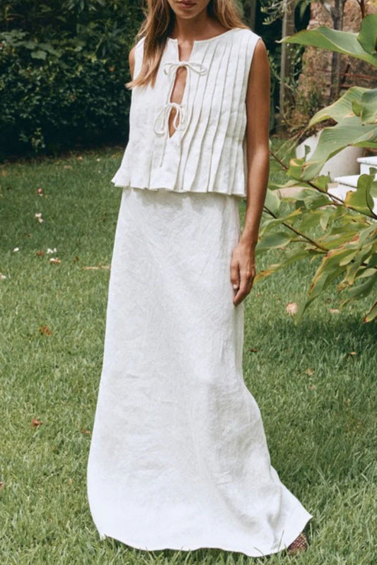 Casual Daily Solid Color Lace Up Ruched O Neck Sleeveless Two Pieces