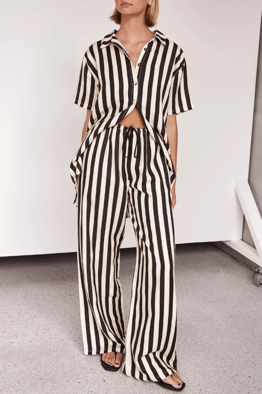 Casual Daily Striped Print Contrast Turndown Collar Short Sleeve Two Pieces
