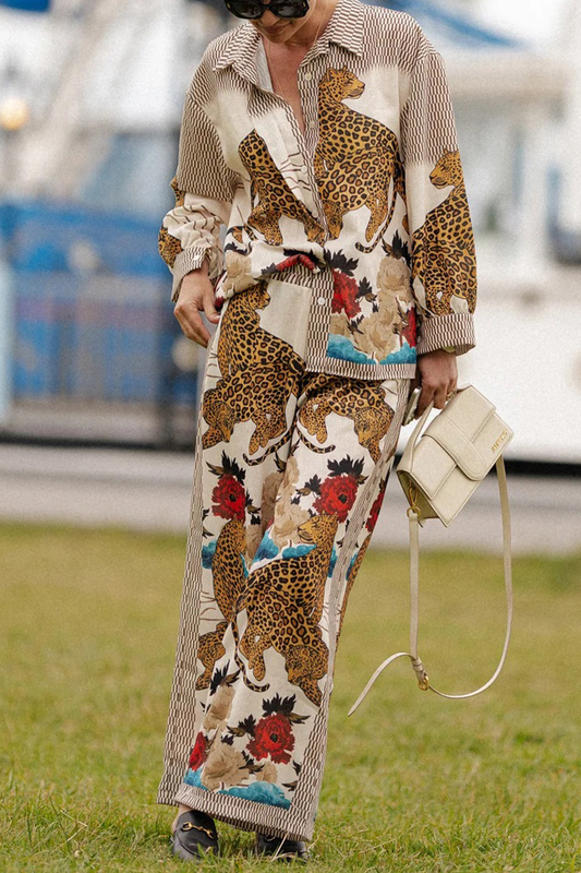 Casual Street Leopard Print Pocket Knotted Turndown Collar Long Sleeve Two Pieces